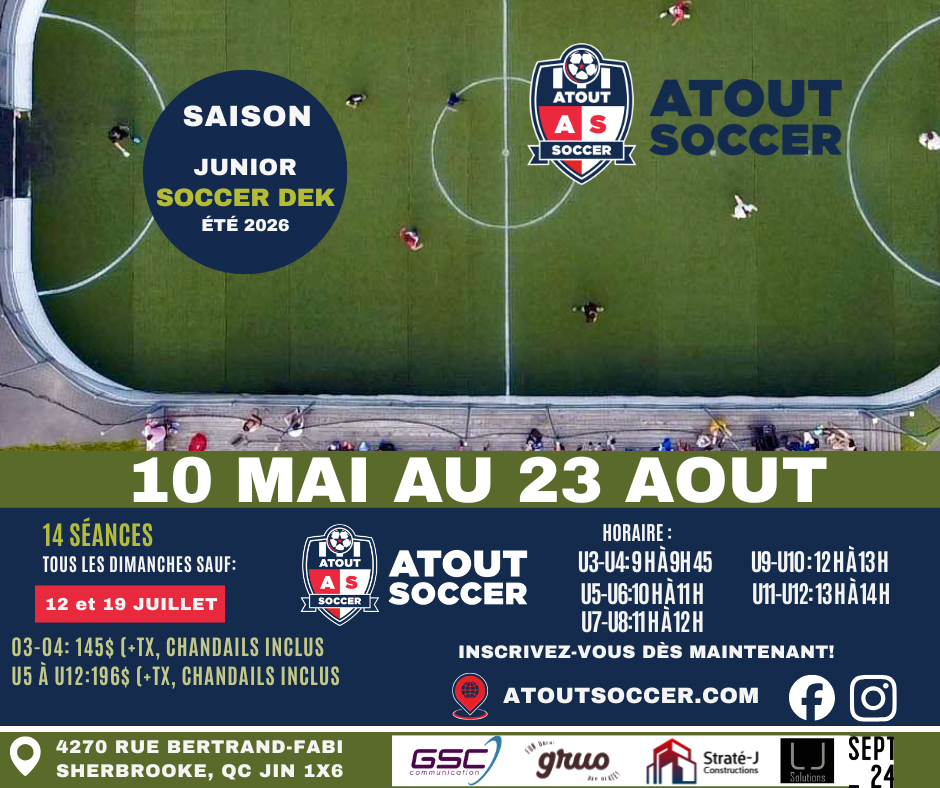 La session de Soccer Dek est pour les enfants de 3 à 12 ans. Le Soccer Dek c’est du futsal sur une surface synthétique. Le terrain est fermé avec des bandes et avec un longue filet pour empêcher le ballon de sortir ce que favorise les prises de décisions rapides, le jeu dans des espaces retreints et un jeu plus dynamique avec plus de 1 contre 1 et plus des tirs au but aussi. Cette année nous avons une toute nouvelle surface!!!! Youpiii!
