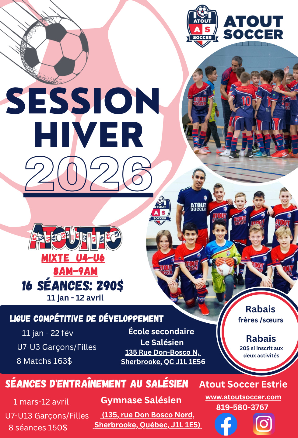 Atout Soccer Estrie lance deux activités pour la session d’hiver: une Ligue Compétitive de Développement qui commence le dimanche 5 janvier -23 février (horaire à venir) et les séances d’entraînement qui commencent le 2 mars (horaire à venir) La ligue, ainsi que les entrainements auront lieu au Salésien (135, rue Don Bosco Nord, Sherbrooke, Québec, J1L 1E5). L’objectif de la ligue est d’offrir une continuité au perfectionnement technique que nous offrons lors de nos séances, d’observer la progression des joueurs en mode compétitif et aussi de découvrir les nouveaux joueurs /joueuses inscrits à notre organisation.